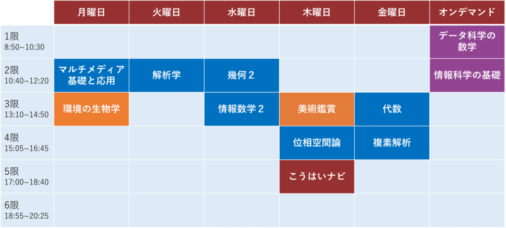解析学、位相空間論、代数、複素解析の4つが数学科の必修で、かなり難易度が高いです(汗)その他の数学科目は選択必修となっていて、僕は情報系の授業を取りました。