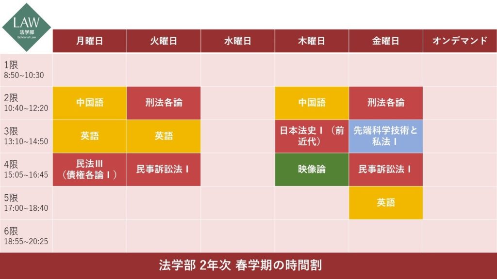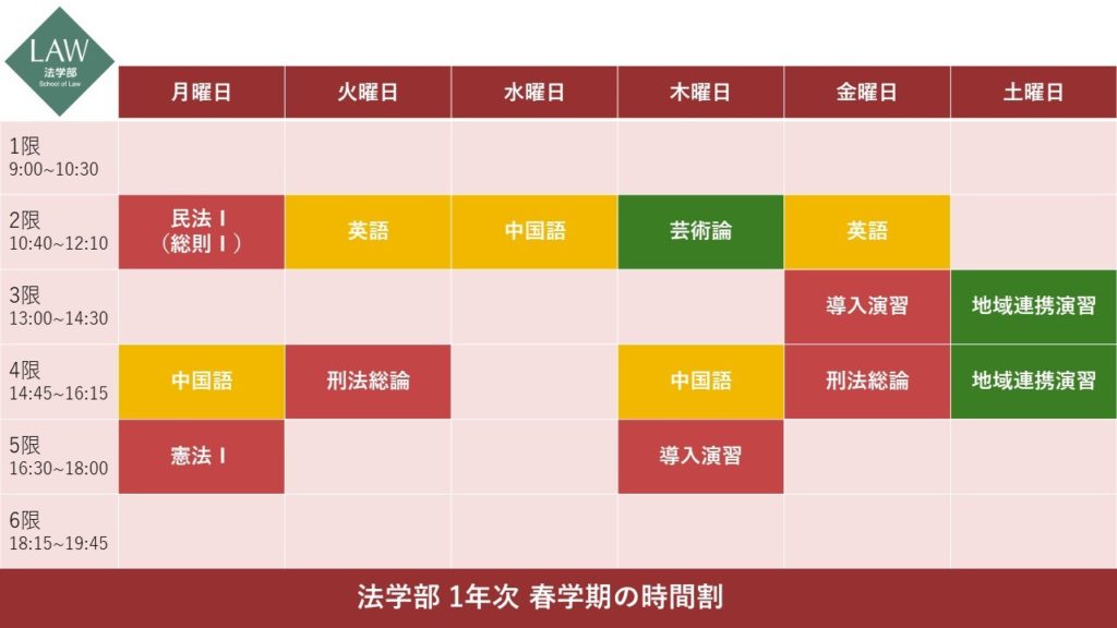 法律必修科目(導入教育科目を含む)は赤、語学は黄、一般教育科目・共通選択科目は緑に色分けをしています。芸術論(木曜の2時限)以外は自動登録科目(履修すべき科目・クラスが、科目登録期間の前にあらかじめ決定している科目)でした。