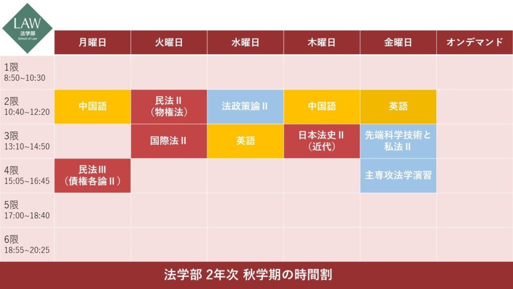 二年生になると法律科目と語学が中心の時間割になります。水色は法律選択科目です。「先端科学技術と私法」は幅広く先端科学技術に関する知識を習得しながら、技術面だけでなくそれらをめぐる私法上の論点を理解し検討します。映像論は各回の授業で1本の映像作品を重点的に取り上げ、その映像を読み解いていきます。二年生になると法律科目が一気に増えるので、歴史や芸術、文化などの分野から自分が興味のある科目を一つ履修するだけでもよいリフレッシュになると思います。