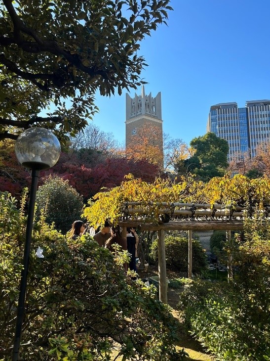 私のサークルの活動拠点でもある大隈庭園は、四季折々の風景を見せてくれる憩いの場です。春の天気がいい日には新歓活動の一環でお昼ご飯会をする学生たちで盛り上がっています。