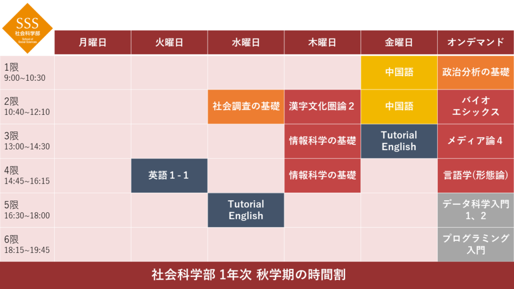 時間割では分かりにくいのですが、「言語学(形態論)」は秋クォーター、「情報科学の基礎」は冬クォーターの授業で、秋学期の半分の期間で行われます。また、共にグローバルエデュケーションセンター(GEC)提供科目という全学部の学生が取ることができる授業です。GECでは興味深い授業が沢山開講されています!