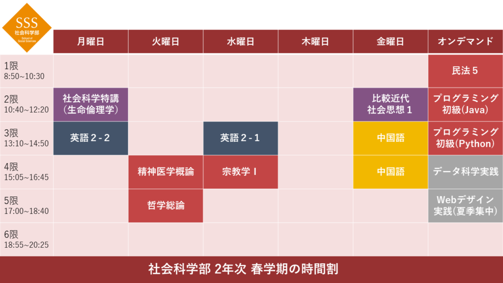 社会科学部は対面の授業も沢山あるのでオンデマンドの授業をほとんど取らないこともできます。ただ、私はオンデマンドの授業が好きなので沢山取っています。履修登録の時はまずオンデマンドの授業から見ています笑