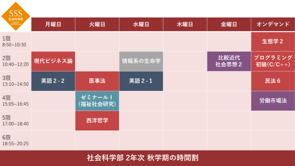 まずは社会科学部生である私の1、2年次の時間割を見てみましょう!