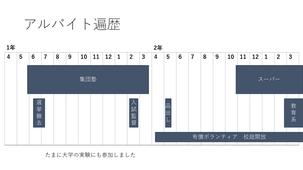 初めてのアルバイトは集団塾の塾講師で、1年生の間はそこで主な収入を得ていました。集団塾のアルバイトで貯金ができたため、そのアルバイトをやめてからは定期的なアルバイトをしない自由な時間を過ごしました。