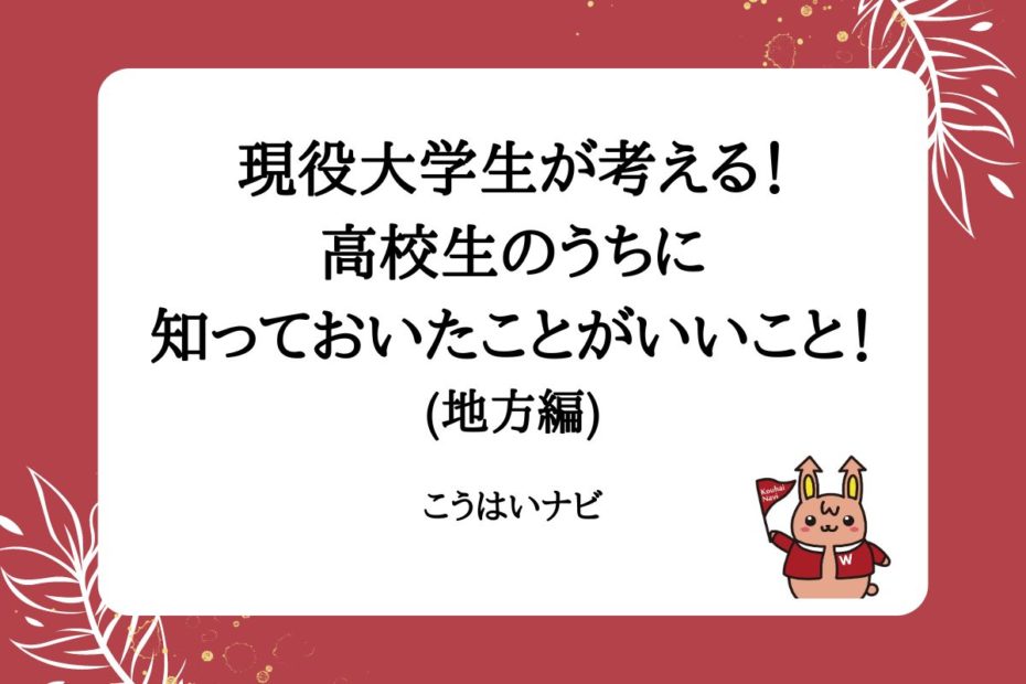 こんにちは!文学部1年こうはいなびスタッフの M です!高校生の皆さんのなかには大学進学と… 続きを読む »現役大学生が考える!高校生のうちに知っておいたことがいいこと!地方編