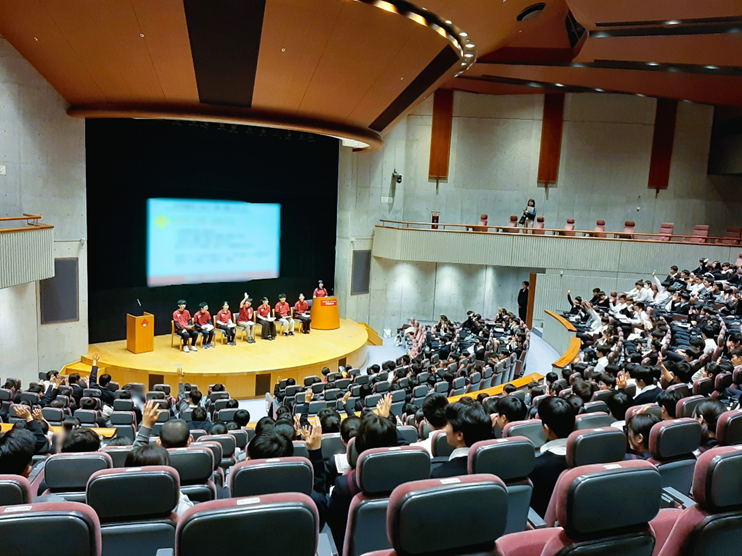 当日は300人の高校1年生の皆さんにお越しいただいて、早稲田大学の井深大記念ホールの大部分が埋まり、壇上から見ると圧巻の光景でした!