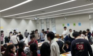 11月3日は「晴の特異日」だそうです。その日も見事な快晴で、季節外れの台風21号の影響で天候が悪かった前日から一転、早稲田祭日和となりました。午後、キャンパスに到着してみると溢れかえる人の波で、あちらこちらの屋台から流れてくる美味しそうな匂いをかぎながら人の波をかき分け、8号館3階に向かいました。